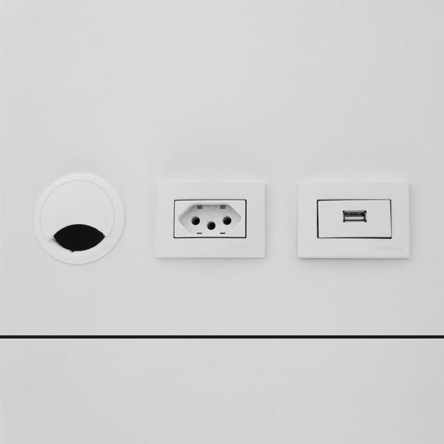 Divisória em MDF (Medium Density Fiberboard) de 14 mm com acabamento em pintura laqueada e madeira maciça (Tauari) tingida com aplicação de verniz. Para uso com estação de trabalho dupla e complemento da mesma linha (vendidos separadamente).Estação de trabalho, dupla, com base em madeira maciça (Tauari) tingida com aplicação de verniz e tampo em MDF (Medium Density Fiberboard) de 18 mm revestido com lâmina de PET. Possui 2 tomadas, 2 entradas USB e sapatas plásticas niveladoras.