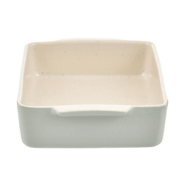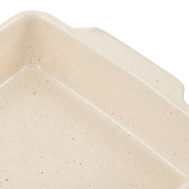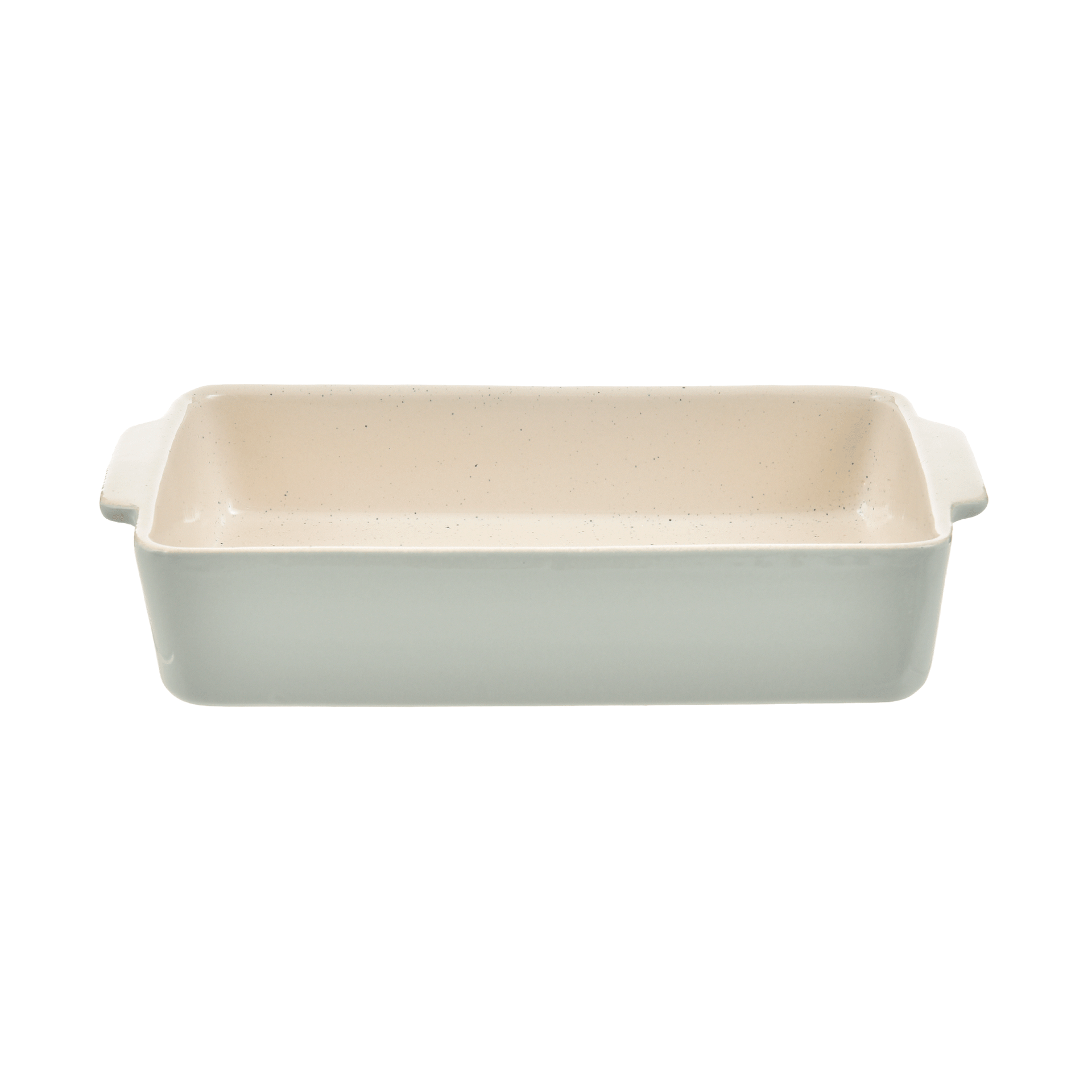 Travessa refratária, em cerâmica com acabamento em pintura. Possui alças laterais para facilitar o manuseio.