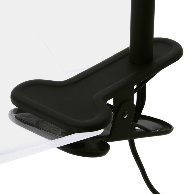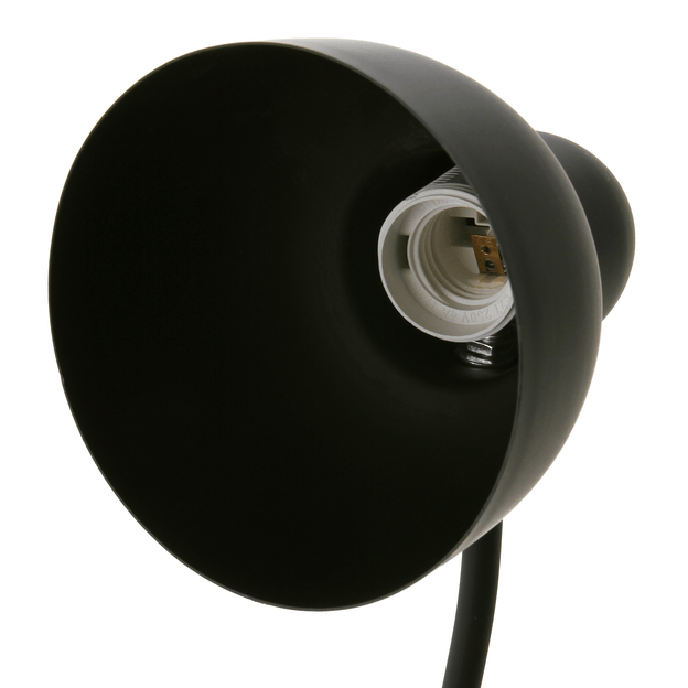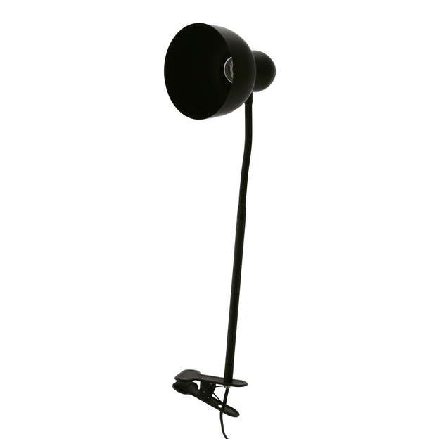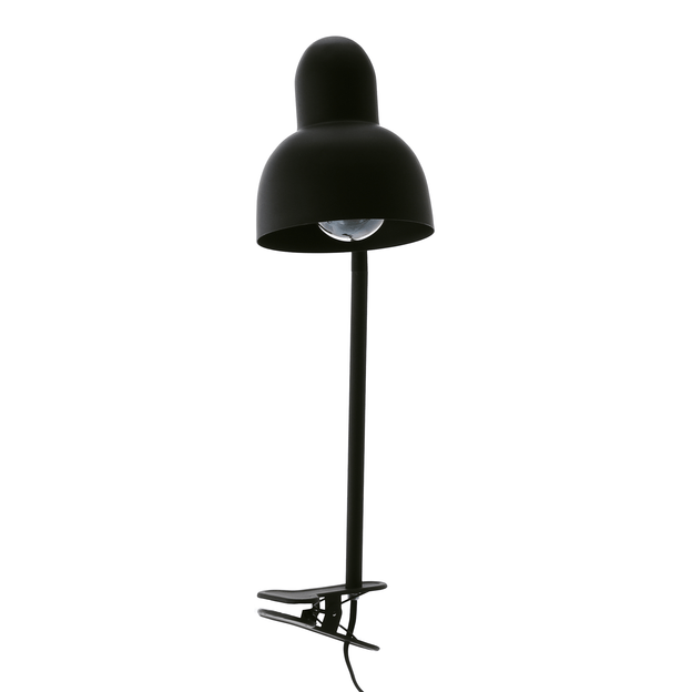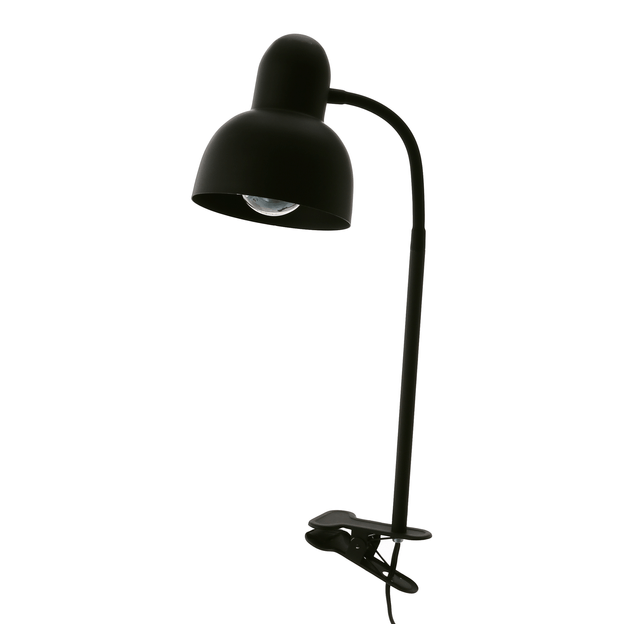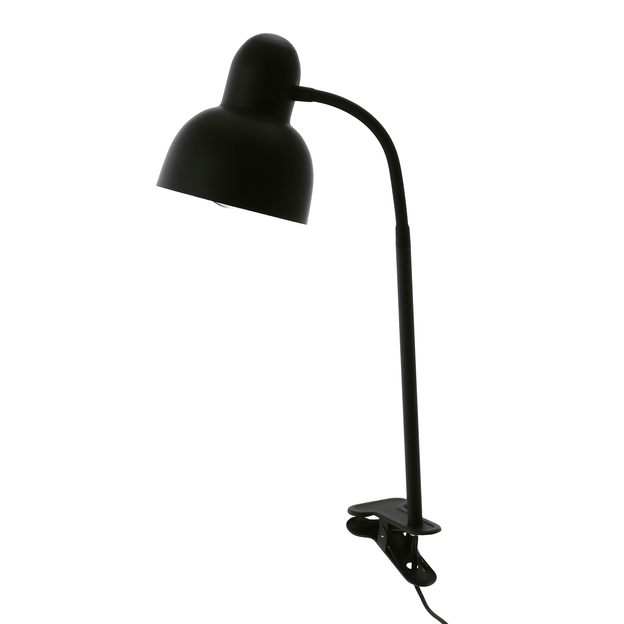 Luminária com garra, 127/220V, com cúpula em chapa de aço com acabamento em pintura epóxi-pó. Possui haste flexível em tubo de aço cromado e foco direcionável.
