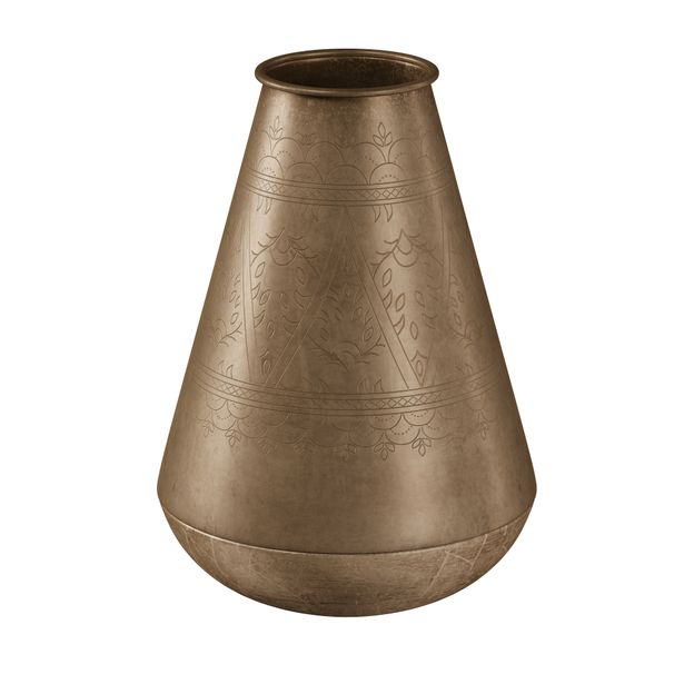 Vaso em ferro com acabamento em pintura e detalhes em relevo.