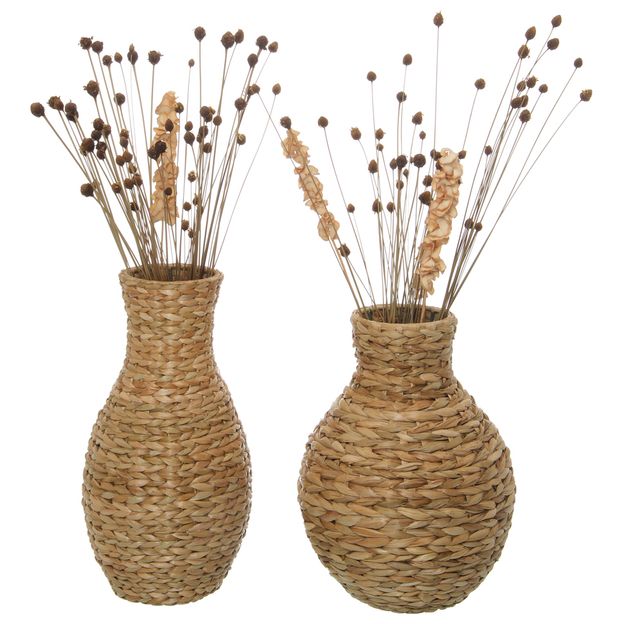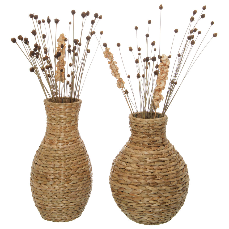 Vaso decorativo, confeccionado artesanalmente com estrutura em ferro revestido com fibra de taboa trançada. Não pode ser utilizado com água. Taboa é uma planta que vive em águas rasas, cujas folhas pontudas e resistentes são utilizadas em artesanato.