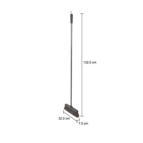Vassoura em polipropileno, com cerdas em PET e cabo em aço inoxidável. Possui alça para que possa ser pendurada.
