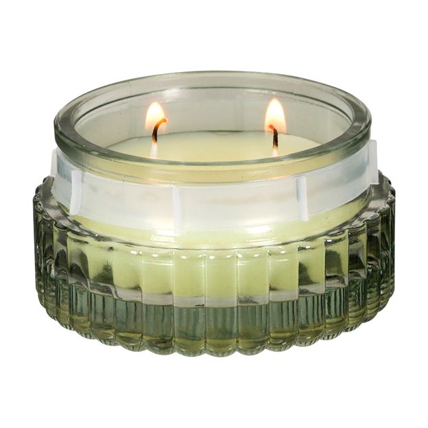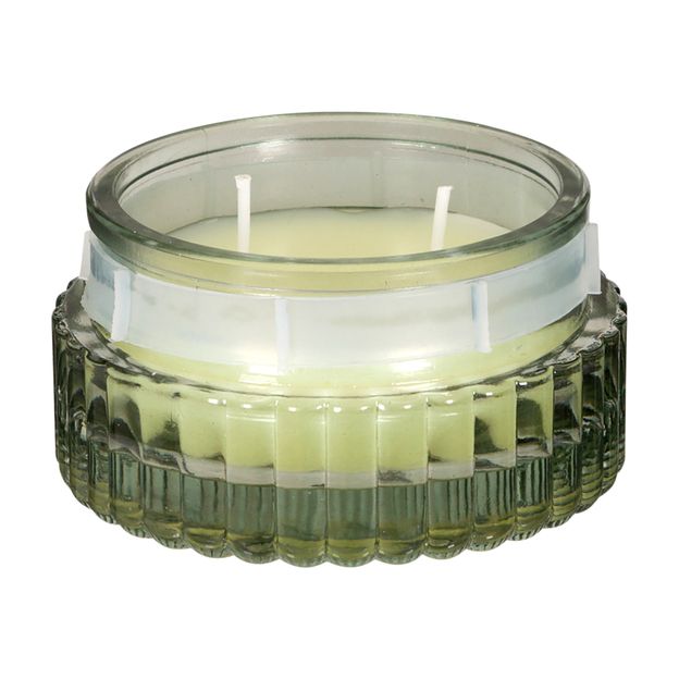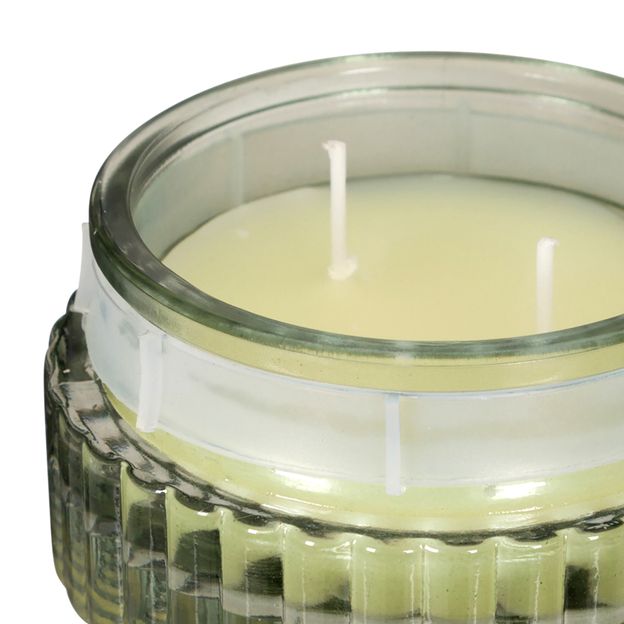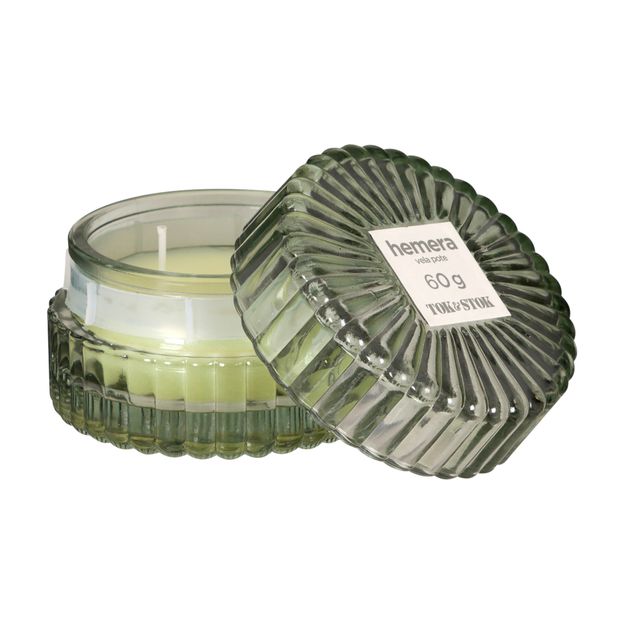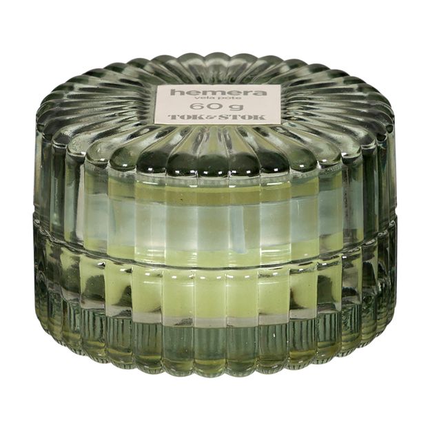 Vela confeccionada artesanalmente em parafina, acondicionada em suporte de vidro com tampa.