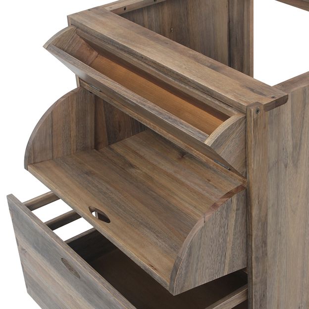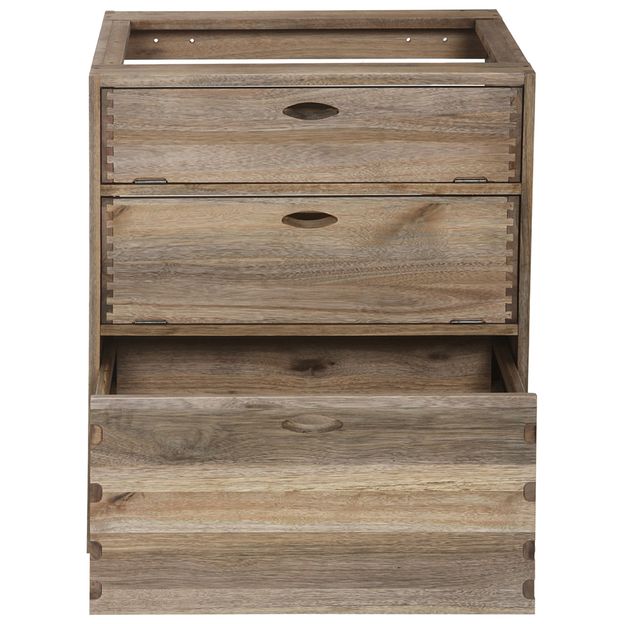 Módulo inferior em madeira maciça (Eucalipto), com aplicação de realçador, selador, cera e polimento manual. Possui 2 portas basculantes e 1 gaveta com corrediças telescópicas.