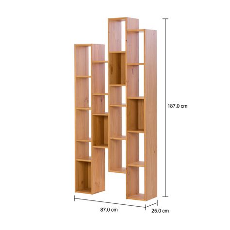 Estante em madeira maciça de reflorestamento (Pinus Elliottii) de 15 mm tingida com aplicação de verniz. Possui 18 nichos, sendo 4 fechados. Permite o uso somente na vertical, apoiada ao solo ou suspensa; sempre fixa à parede (componentes inclusos).
