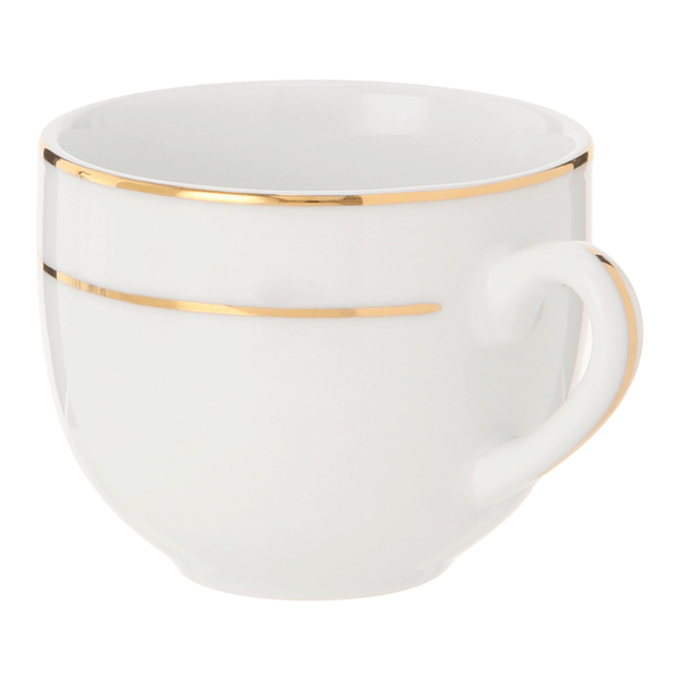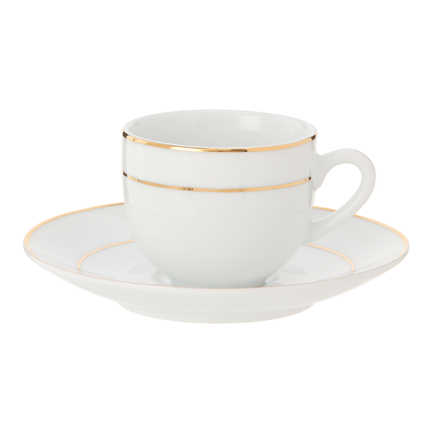 Xícara para café, com pires, em porcelana com detalhe em pintura metalizada à base de ouro em pó.